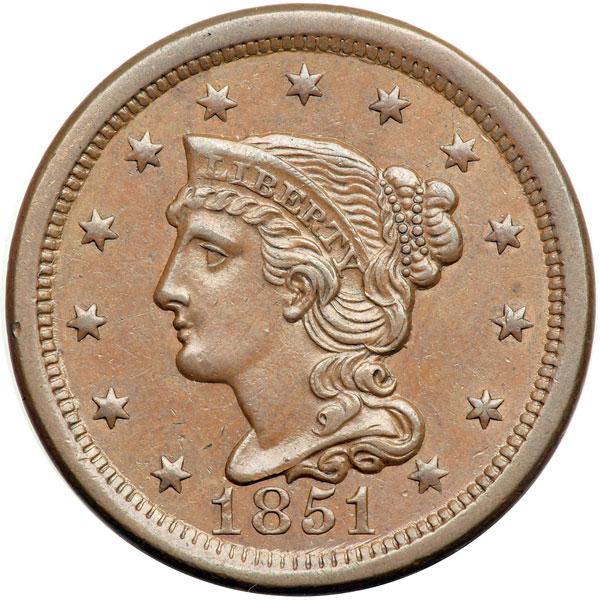 1851 N-13 R1 EF45. Nice glossy medium brown with frosty lighter brown in protected areas. A tiny rim nick at star 3 is the only defect. Sharp EDS, die state a. The diagonal die lines from the dentils under 851 are clear. DWH #1148.