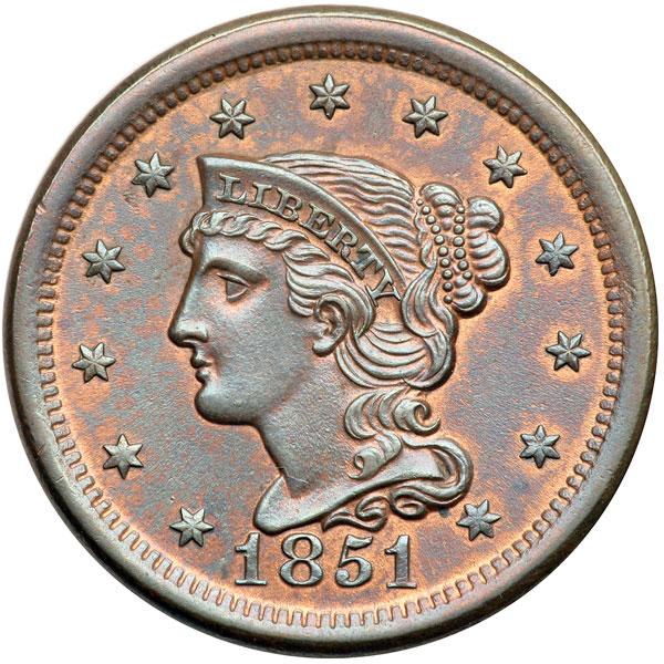 1851 N-14 R2 First 1 Repunched MS60+. Lustrous bluish steel and chocolate with slightly faded red covering about 30% of the obverse and 10% of the reverse, possibly from an old chemical cleaning. Excellent luster and eye appeal regardless. No spots or stains, the only mark a tiny rim nick over star 4. M-LDS, die state c. The die lines at the throat and repunching under the first 1 are gone. Tied for CC#7 in the Grellman census. DWH #1938.