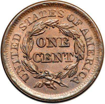 1851 N-18 R1. MS-62 Plus. Very attractive frosty steel brown and light chocolate with very faded mint color showing through the toning on at least a third of the obverse. No spots or stains. This cent would be choice except for a dull nick or planchet chip on the rim at star 3 and a small chip in the dentils over the second T in STATES. M-LDS, die state c. The crack from the hairbun to star 10 is clear but the points down from the N's in ONE CENT are gone. Tied for CC#7. Removed from an NGC slab graded MS64 Brown (NGC label included).