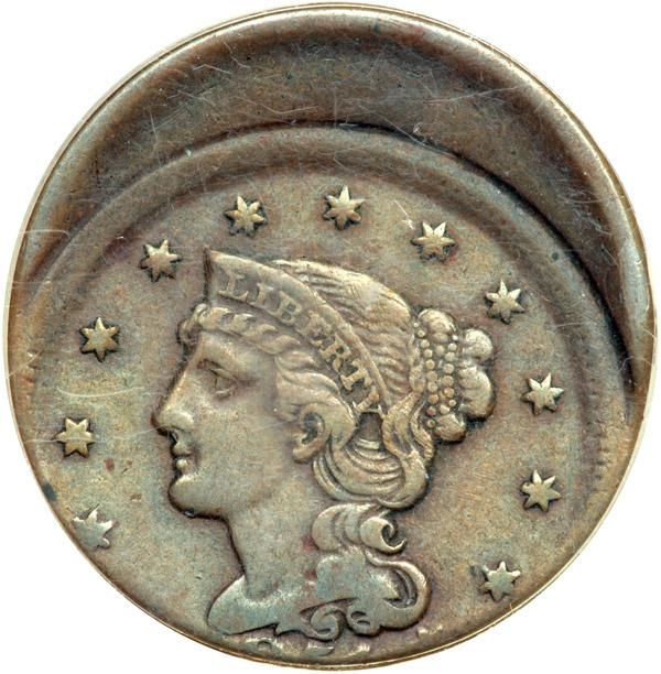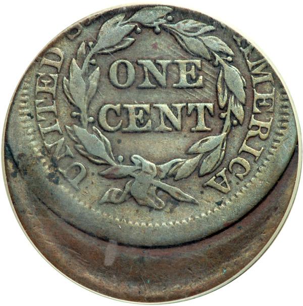 1851 N-19 R3 PCGS graded VF35. Off Center. Frosty light olive and steel. The only marks are a couple tiny carbon spots on the rim over UN in UNITED. Struck 20% off center to K-6 leaving all but the very top of the date off the planchet. Fortunately there are enough die markers remaining to positively identify the variety, including many strong die lines on the reverse and a fine die crack through star 4 to the nose. Our grade is VF20. The "Mint Error" status of this cent is noted on the PCGS label.