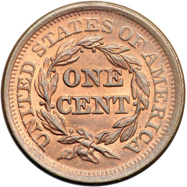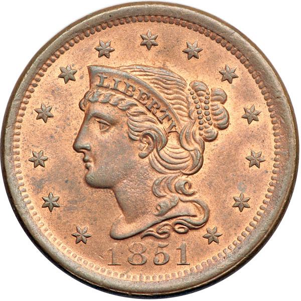 1851 N-2 R1 MS64. Mint red fading to steel brown on the highpoints, about two-thirds of the mint color remaining. No spots or notable signs of contact. LDS, die state b. The die line at the throat and the ones at the inner curl are gone. The dies are worn and the top of the 8 is weak. A very attractive example, close to gem quality. Tied for CC#6 in the Grellman census. DWH #2252.