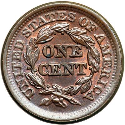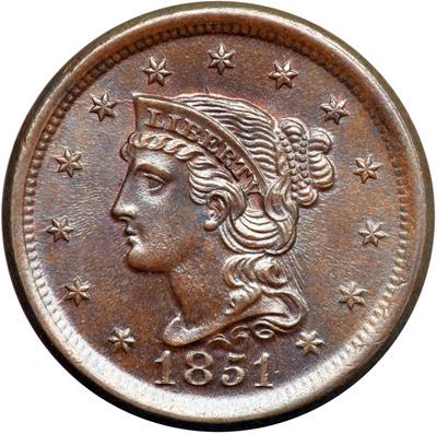 1851 N-20 R3. MS-63. Both 1's Repunched. Choice, highly lustrous chocolate brown with overtones of light bluish steel and mellowed mint red covering 5% of the planchet, mostly on the reverse. The only mark is a small spot of very fine carbon on the bottom of the O in ONE. LDS, die state c. The repunching on the 1's is gone and the tops of the C & E in CENT are joined by crumbling. This is Newcomb's old #28. Tied for CC#5 in the Grellman census.
