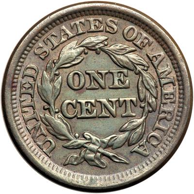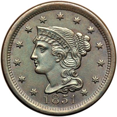 1851 N-21 R4. AU-58. Frosty light olive and bluish steel with satiny mint luster showing in the protected areas. The only marks are a tiny tick hidden in the hair right of the earlobe and a thin, barely visible vertical scratch on the inner curl. Neither of these marks is distracting, in fact they are hard to see. MDS, die state b. The strong die lines behind ONE CENT have been lapped off the die leaving only short points from some of those letters. Tied for CC#5.