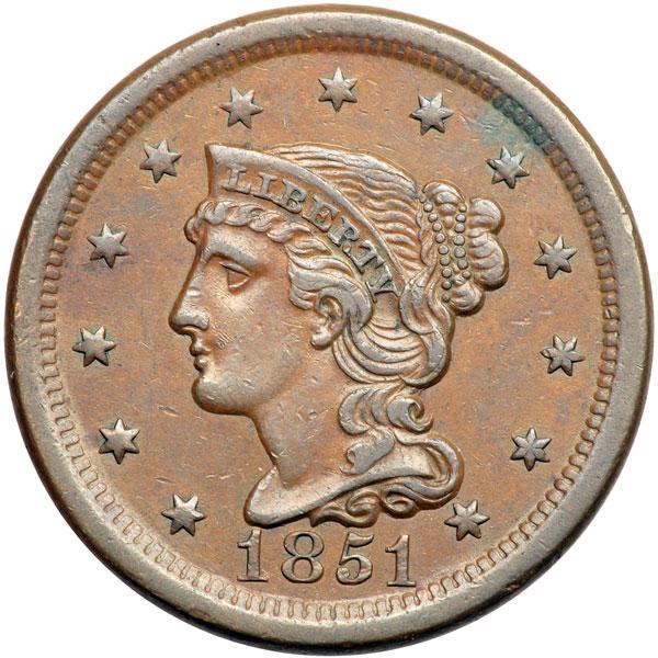 1851 N-23 R3 VF35. Glossy medium brown with steel brown toning on the obverse highpoints. A splash of darker bluish steel toning over star 9 and a tiny rim nick at star 10 are the notable marks. EDS, die state a, with fine die lines from the dentils over TA in STATES. DWH #1166.