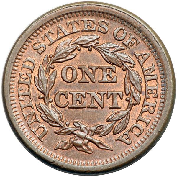 1851 N-25 R3 MS62. Frosty light steel brown with 20-25% of the original mint red remaining. The only notable defects are a small stain of darker steel toning between the T & Y in LIBERTY and a few tiny rim nicks under the ribbon tip. E-MDS, die state a. The points at the throat are visible and the fields are slightly rough from fine die flowlines. Tied for finest known honors, and only one other mint state piece is known in state a. Removed from an NGC slab graded MS66BN (NGC label included). DWH #2168.