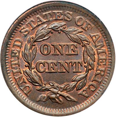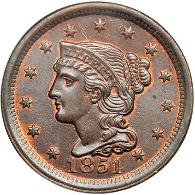 1851 N-25 R3-. PCGS graded MS-65 Brown. Choice lustrous chocolate and bluish steel with at least 10% of the original mint red remaining on both sides. Excellent eye appeal, but there are a few contact marks. These include a couple tiny pinscratches right of star 6, a few more under IC in AMERICA, and a shallow scrape on the base of the second T in STATES into the leaf below. M-LDS, die state b. The points down from the throat are gone but the short spike down from the dentils left of star 8 is visible. Our grade is MS60+, tied for CC#4 in the Grellman census.