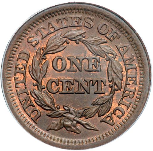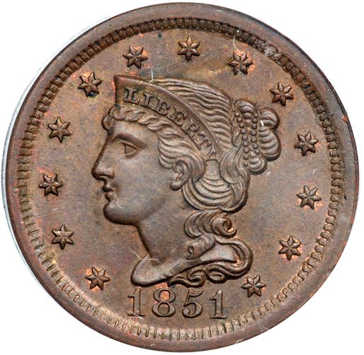 1851 N-30 R2. PCGS graded MS-64 Brown Plus. Lustrous steel brown with traces of mint color remaining on the obverse and at least 10% of the red remaining on the reverse. Excellent eye appeal. The only marks are a small spot nestled between the lower two points of star 5 and a wisp of very slightly darker steel brown toning across the coronet tip. Nicely struck E-MDS, die state a late. The points from the top of ENT in CENT are clear but the fields are starting to show microscopic radial flowlines. Our grade is MS60+, CC#6 in the Grellman condition census for this variety.