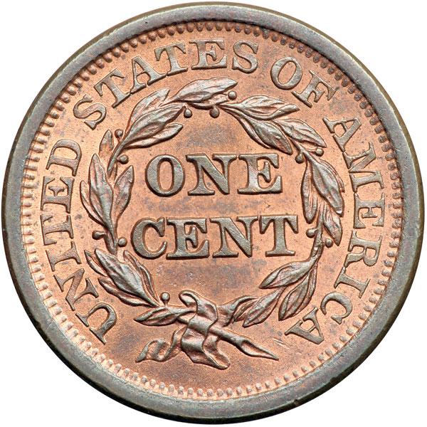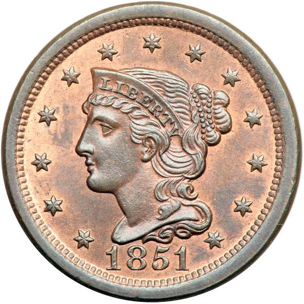 1851 N-31 R3+ MS65. Lustrous mint red mellowing to light bluish steel brown, about two-thirds of the red remaining. The surfaces are satiny and offer outstanding eye appeal. The only marks are a tiny, light nick just right of star 13 and two very tiny rim ticks off the stem tip. Nicely struck E-MDS, die state b. The spur from star 2 is gone and a sharp die lapping line has been added from the berry over N in ONE down to the right top of the N in CENT. A very attractive cent, CC#2 behind a slightly finer example in the Grellman census. DWH #3255.
