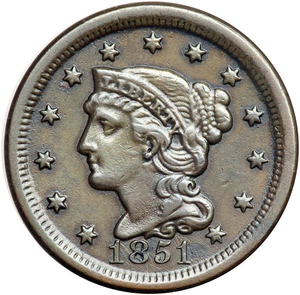 1851 N-34 R4 VF35. Slightly sharper but there are a few faint scratches at the date. Glossy light olive and chocolate brown fading to darker olive brown in protected areas. The only other mark is a tiny spot of reddish verdigris nestled between the lower left points of star 5. LDS, die state b. A decent example of this tough variety struck from severely blunted dies.