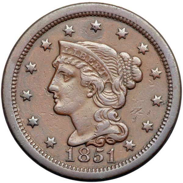 1851 N-36 R6- VF30. Glossy medium reddish brown, possibly recolored but still attractive. There are a few light contact marks on the obverse, the strongest in the field right of the inner curl, plus a splash of darker chocolate toning on star 7. EDS, die state a early, with fine vertical lapping lines covering much of the reverse. (There is no state b for this variety.) CC#3 of this rare variety. DWH #2173.