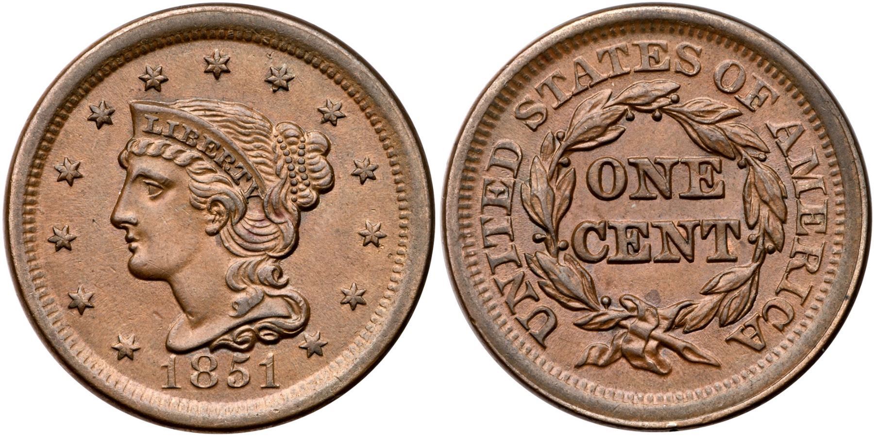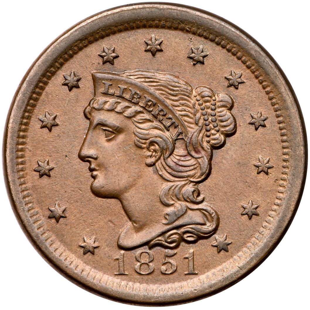 1851 N-39 R-3 AU50Choice tan brown mellowed down from faded mint color, mellowed to light steel on the high points. There is a small hairline scratch from below the lips through the chin, and a tiny nick above the bust tip. Frosty, lustrous surfaces with great eye appeal. EDS.Certificate Number: Pedigree: Ex; Thomas D. Reynolds - Phil Moore