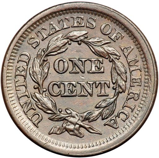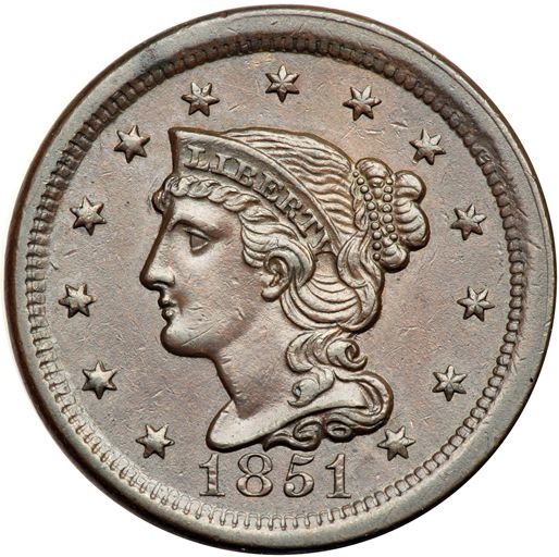 1851 N-39 R3 EF45. Glossy light chocolate brown and steel with frosty luster covering the protected areas. A spot of very fine carbon on the rim above star 6 is the only notable mark, and it is barely visible. Great eye appeal for the grade. Sharp EDS, die state a. The small bar defect near the dentils above star 3 is clear.