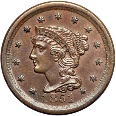 1851 N-39 R3. AU-50. Glossy light chocolate and steel brown with frosty luster covering the protected areas on both sides. A half dozen small spots of dark toning on the reverse are the only notable marks. E-MDS, die state a, with a short but clear bar near the dentils over star 3.