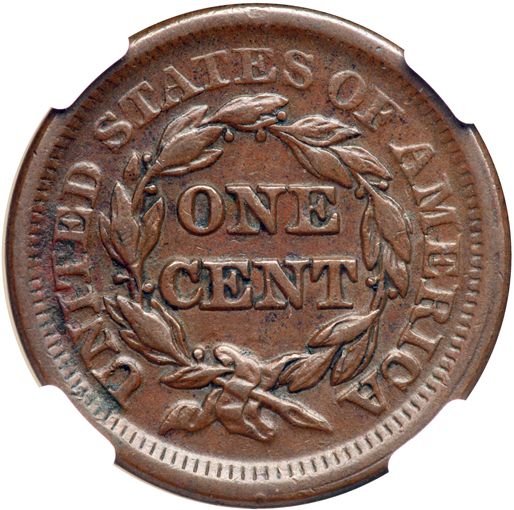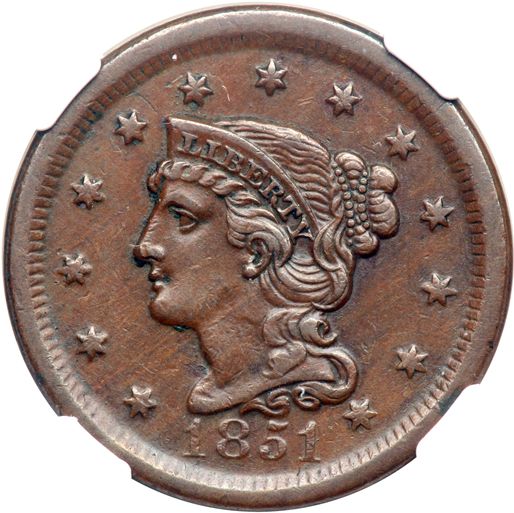 1851 N-41 R4. NGC graded AU-53. Glossy medium chocolate brown. The only defects are a nick on the tip of the nose and some shallow verdigris at ITE in UNITED. LDS, die state c, with a shallow rim cud break over ME in AMERICA. Our grade is VF35.