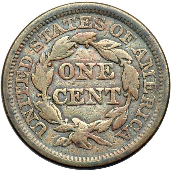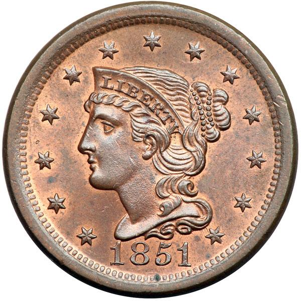 1851 N-42 R8+ (Unique) Not For Sale. This is the only die variety of the late date cent series (1840-1857) not represented in the Dan Holmes collection. The unique example, which grades VF35 to EF40, is in the collection of Thomas R. Wagemaker of Minnesota, who discovered the new variety in 1986. At the request of Bob Grellman (who certified the new variety), that coin was included as lot #1624 in the Jack Robinson sale conducted by Superior on 1/29/89, and it was plated in that catalog. It was graciously added to that sale in an effort to expose the new variety to the collecting public, but the owner had no intent to sell and repurchased it at the auction. The N-42 variety comes from a marriage of two easily identifiable dies that were used to strike other varieties. In spite of decades of exposure in Grellman's attribution guides and the "Cherrypicker's Guide," no new examples have surfaced. The obverse is from N-1 in its earliest die state and the reverse is from N-44, probably earlier. The photos used here are NOT of the unique N-42. Instead, these photos are of the N-1 obverse and N-44 reverse of those varieties in this sale.