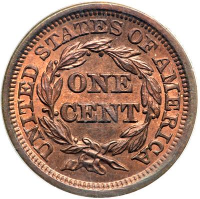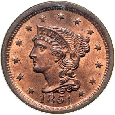 1851 N-43 R5. PCGS graded MS-65 Red & Brown. Lustrous slightly mellowed mint red fading to steel brown and light chocolate on the devices, about 75% of the planchet showing the faded mint color. Excellent eye appeal, nearly flawless. The best identifying marks are a tiny tick on the coronet over the L, a barely visible planchet flake connecting the lower right point of star 13 to the dentils below, and a faint streak of slightly darker toning up to the right from the top of star 13. Sharply struck EDS, die state a. The points from the neck are clear and the spike up from the top of the E in CENT is sharp. A very attractive example of this rare variety. Our grade is MS63+, CC#6 in the Grellman census.