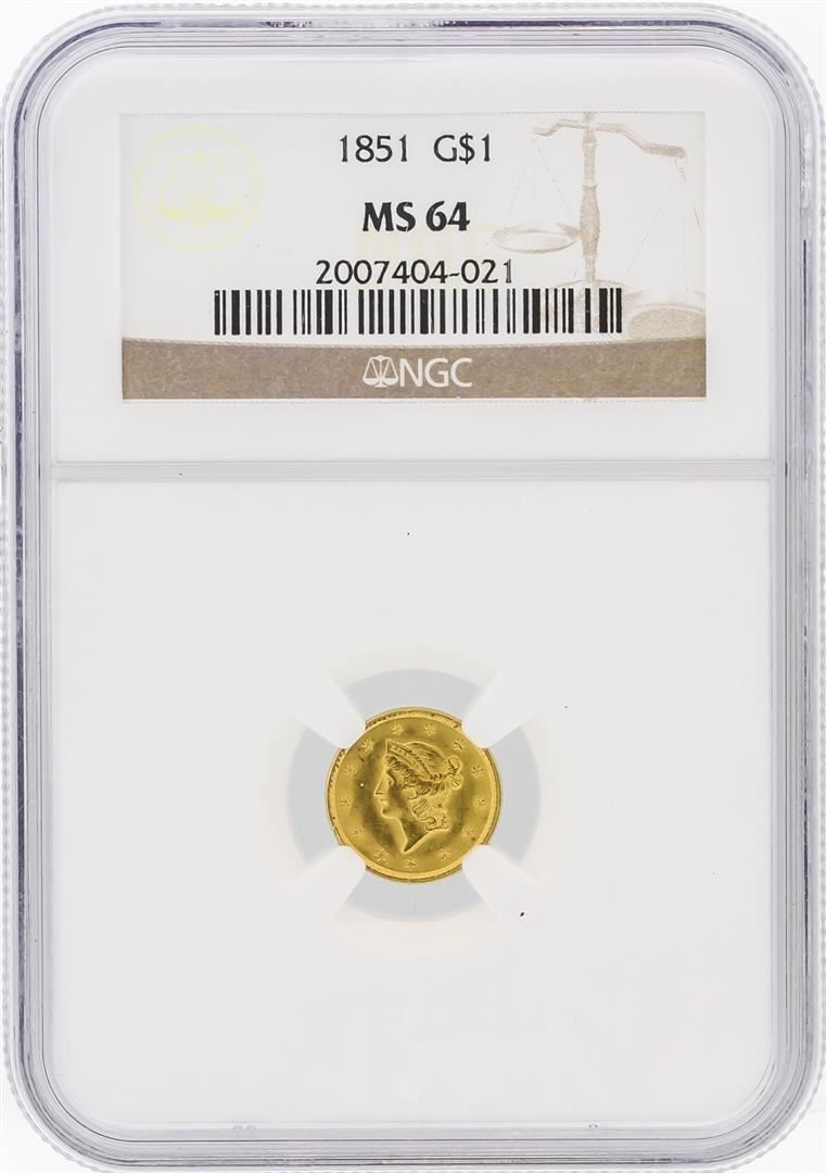 One 1851 NGC MS64 $1 T-1 Liberty Head Gold Coin. NGC Certified.