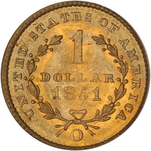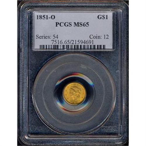 <b>1851-O $1 Gold Liberty. PCGS graded MS65.</b> The surfaces are sleek and glowing with a healthy show of frosty Gem quality gold color. There is no detraction in the surface luster. What one sees usually on this mint's coinage is a less than persuasive impression left following the withdrawal of the dies; greatly to our pleasure and the bidders' enjoyment, on the other hand, that is not the case here. This coin is sharp, very sharp, in fact, which we are certain is one reason among many it earned a coveted MS65 grade from the service <b>(PCGS # 7516)</b> <i>