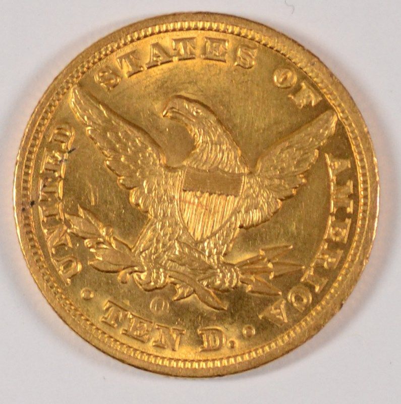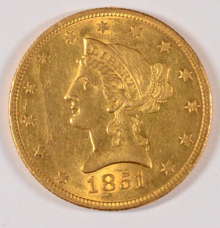 1851-O $10.00 GOLD, MS-62, NICE YELLOW COLOR, RARE, SELDOM FOUND IN MINT STATE