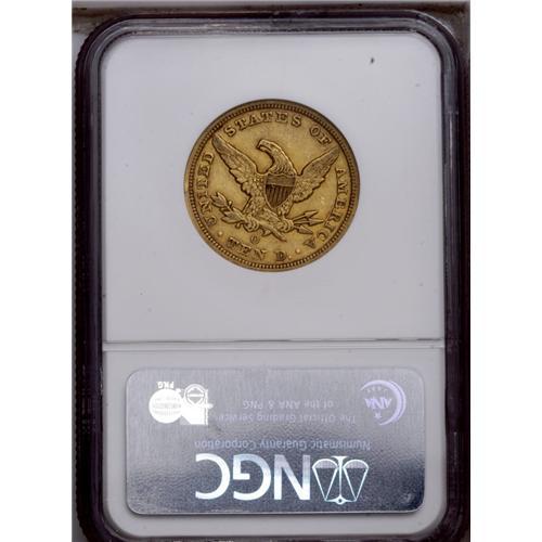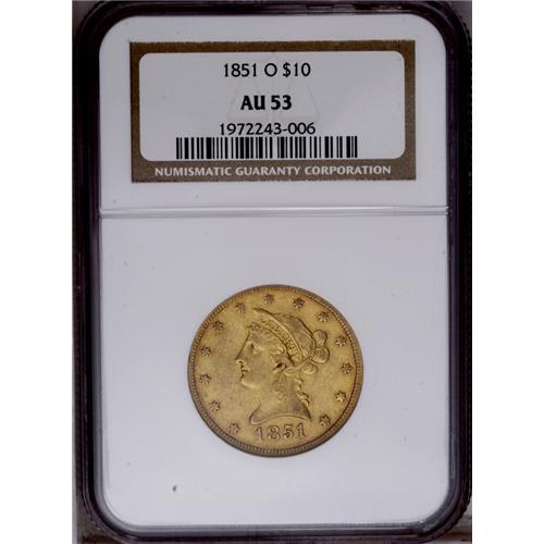 <B>1851-O<$10> AU53 NGC.</B></I> A greenish-gold piece with a typical obverse strike and some wispy slide marks across each side. The bold ring atop the second shield stripe is always present on this O-mint date.