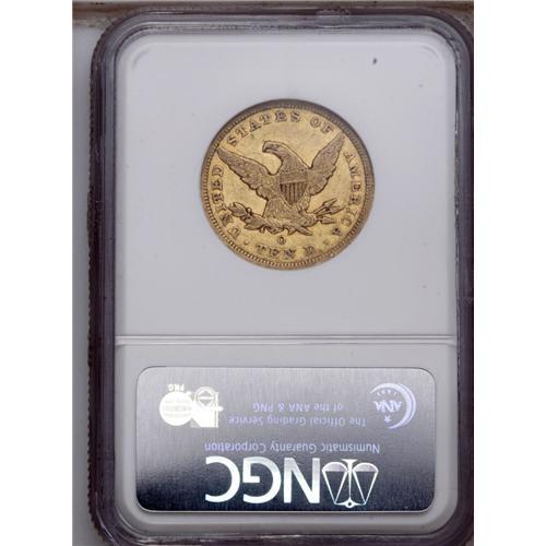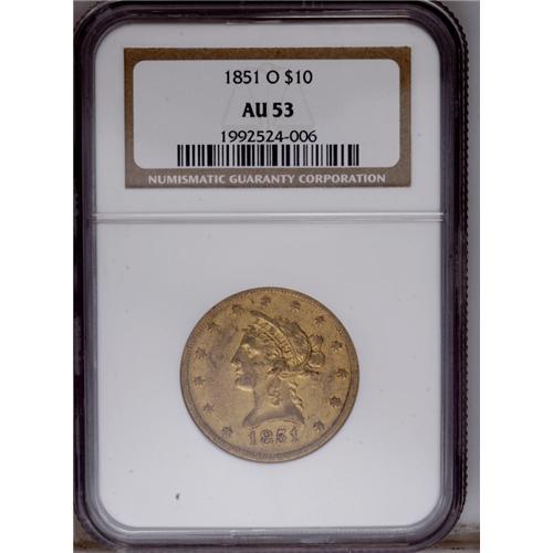 <B>1851-O<$10> AU53 NGC.</B></I> Substantial glowing luster outlines design elements. Typically struck, and a thin horizontal lamination is seen on the central obverse. A shield ring rests atop the second stripe, as always for the issue.