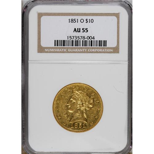 <B>1851-O $10 AU55 NGC.</B></I> Well-defined in the centers with modest reflectivity in the fields that peeks through numerous abrasions and modest wear. The yellow-gold reverse displays the enigmatic "Ring in Shield," one of the most enduring mysteries of New Orleans coinage.<BR><BR><b>Shipping:</b> Coins & Currency (<a target="_blank" href="http://www.heritageauctions.com/common/shipping.php">view shipping information</a>)