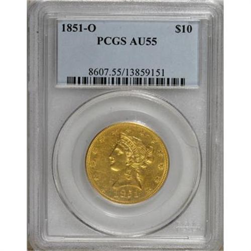 <B>1851-O $10 AU55 PCGS.</B></I> The 1851-O eagle is popular with New Orleans gold type collectors, and though Winter (2006) notes a substantial population of remaining 1851-O eagles (anywhere from 650 to 850-plus survivors), most of the available examples are in VF or XF, and pleasing AU or better pieces remain elusive. This example has lightly abraded, pale orange-gold surfaces that are mildly prooflike despite areas of wear and cloudiness. Solidly struck in the centers, though the peripheral elements lack definition as always. Population: 30 in 55, 20 finer (6/07).<BR><BR><B>Coin Engraver:</B> Christian Gobrecht<BR><BR><b>Shipping:</b> Coins & Currency (<a target="_blank" href="http://www.heritageauctions.com/common/shipping.php">view shipping information</a>\)