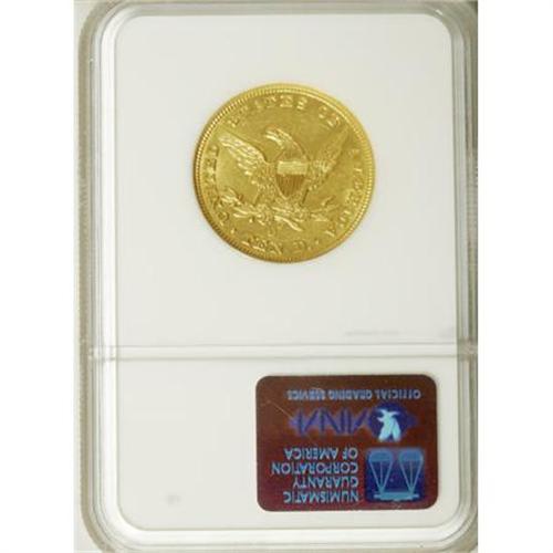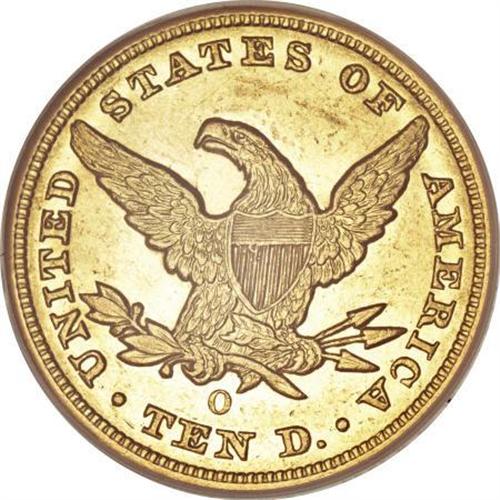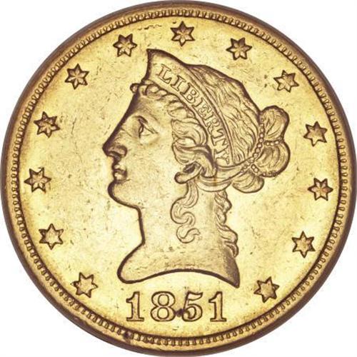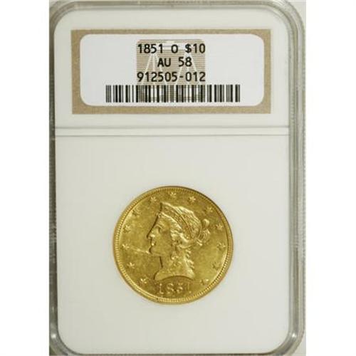 <B>1851-O $10 AU58 NGC.</B></I> Breen-6898, with circular center punch at the top of the second stripe. A popular, high mintage O-mint ten that can occasionally be located in AU condition. This piece has bright, semiprooflike surfaces and luminous yellow-gold color. Sharply defined in the centers with slight weakness on the peripheral stars. Minimally abraded.<BR><BR><B>Coin Engraver:</B> Christian Gobrecht<BR><BR><b>Shipping:</b> Coins & Currency (<a target="_blank" href="http://www.heritageauctions.com/common/shipping.php">view shipping information</a>)