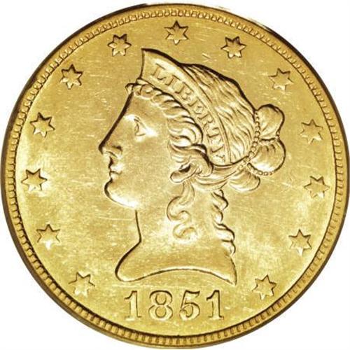 <B>1851-O $10 AU58 PCGS.</B></I> The mintage of 263,000, rather significant for an early New Orleans eagle, gives little clue about the high-grade rarity of the date. Few of these pieces were saved at the time of issue. A gorgeous near-Mint piece with sharp design details, especially at the centers, yet with flat stars entirely around the obverse. The satiny surfaces are highly lustrous yellow-gold with virtually full mint brilliance. Population: 14 in 58, 8 finer (12/07).<BR><BR><B>Coin Engraver:</B> Christian Gobrecht<BR><BR><b>Shipping:</b> Coins & Currency (<a target="_blank" href="http://www.heritageauctions.com/common/shipping.php">view shipping information</a>)