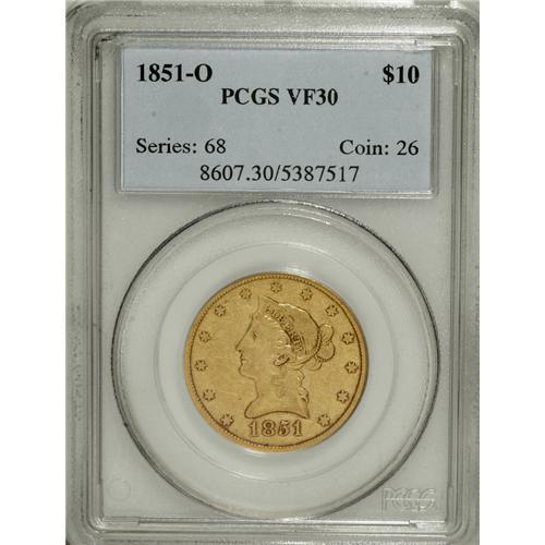 <B>1851-O $10 VF30 PCGS.</B></I> PCGS Population (7/374). NGC Census: (21/681). Mintage: 263,000. Numismedia Wsl. Price: $363. (#8607)<BR><BR><b>Shipping:</b> Coins & Currency (<a target="_blank" href="http://www.heritageauctions.com/common/shipping.php">view shipping information</a>)