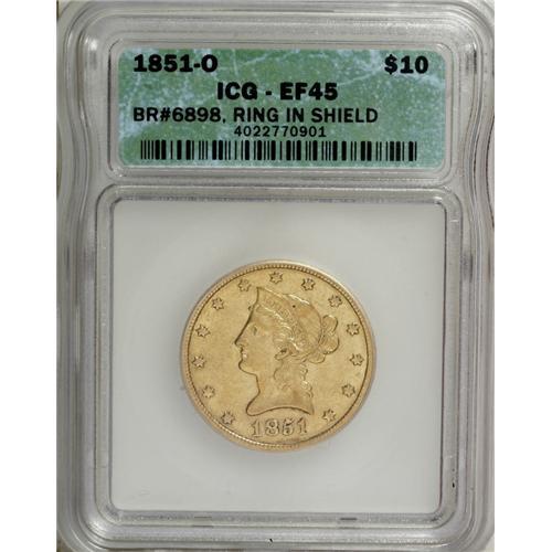 <B>1851-O $10 XF45 ICG.</B></I> Variety Two, Ring in Shield. Winter differentiates this variety from Breen-6898 on the basis of a different obverse die. This well struck, lightly worn orange-gold example has significant peripheral luster on each side and few marks.<BR><BR><b>Shipping:</b> Coin/Currency (<a target="_blank" href="http://www.heritageauctions.com/common/shipping.php">view shipping information</a>)
