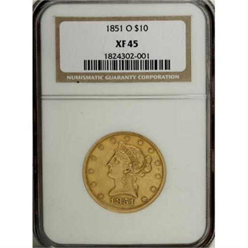 <B>1851-O $10 XF45 NGC.</B></I> NGC Census: (161/481). PCGS Population (103/148). Mintage: 263,000. Numismedia Wsl. Price for NGC/PCGS coin in XF45: $578. (#8607)<BR><BR><B>Coin Engraver:</B> Christian Gobrecht<BR><BR><b>Shipping:</b> Coins & Currency (<a target="_blank" href="http://www.heritageauctions.com/common/shipping.php">view shipping information</a>)