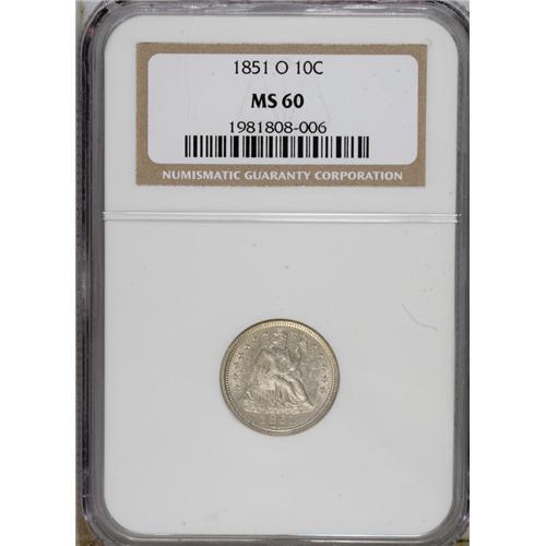 <B>1851-O 10C MS60 NGC.</B></I> Well struck and lustrous, with just a bit of champagne toning on the reverse. Wispy obverse field marks limit the grade. A scarce New Orleans Mint issue which is rare in Mint State. Census: 1 in 60, 4 finer (4/07).<BR><BR><b>Shipping:</b> Coins & Currency (<a target="_blank" href="http://www.heritageauctions.com/common/shipping.php">view shipping information</a>)