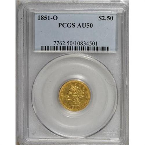 <B>1851-O $2 1/2 AU50 PCGS.</B></I> PCGS Population (22/44). NGC Census: (28/262). Mintage: 148,000. Numismedia Wsl. Price for NGC/PCGS coin in AU50: $725. (#7762)<BR><BR><B>Coin Engraver:</B> Christian Gobrecht<BR><BR><b>Shipping:</b> Coins & Currency (<a target="_blank" href="http://www.heritageauctions.com/common/shipping.php">view shipping information</a>)