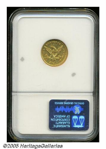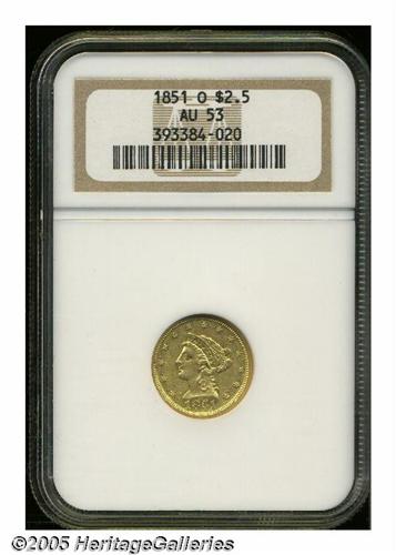 <B>1851-O<$2 1/2> AU53 NGC.</B></I> Doubled Date, Breen-6214. While one of the higher mintage O-mint quarter eagles, the '51-O is surprisingly difficult to locate in better grades (AU and up). This piece is well struck on the obverse and shows the usual soft strike on the eagle on the reverse. Bright and semi-prooflike, there are really no marks of any consequence on either side.
