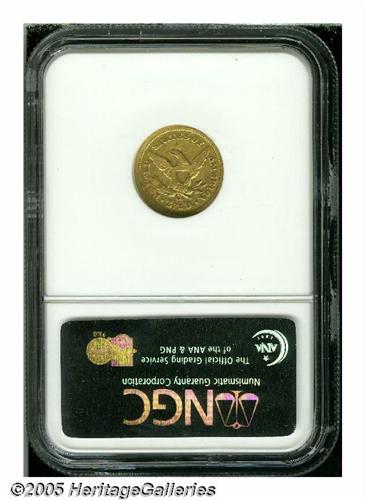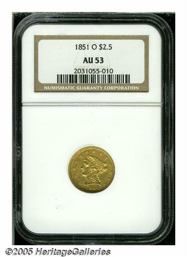 <B>1851-O<$2 1/2> AU53 NGC.</B></I> While generally considered to not be that rare an issue because of its relatively high mintage of 148,000 pieces, the 1851-O Quarter Eagle is surprisingly scarce, especially above XF. Only 110-120 pieces are believed known in all grades with a mere 14-16 coins extant today in the various grades of AU. This example is well defined on each side, especially for this issue (which is usually soft), though the eagle's right leg is soft. The surfaces show a few minute abrasions, and bright yellow-gold coloration.
