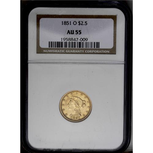 <B>1851-O<$2 1/2> AU55 NGC.</B></I> The eagle's neck and legs are softly struck, but this O-mint example has ample luster and unmarked surfaces. The date is nicely repunched southwest. Curiously, the B in LIBERTY is completely absent, presumably because that letter was filled on the die.