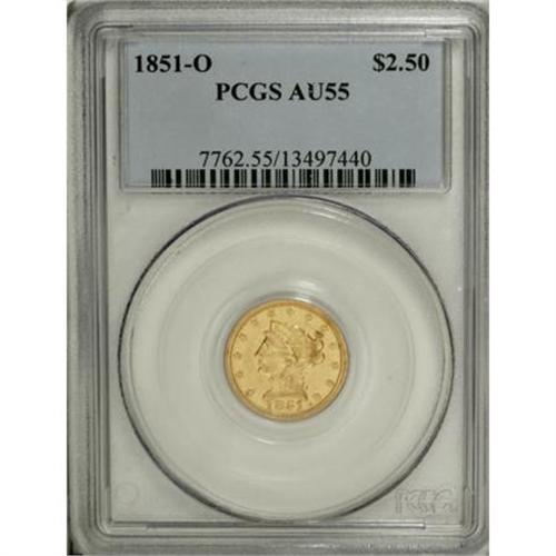 <B>1851-O $2 1/2 AU55 PCGS.</B></I> The portrait and stars show strong detail for this O-mint issue, though the eagle exhibits softer definition. Soft luster enlivens the vast majority of its emerald-inflected orange-gold surfaces. Population: 17 in 55, 20 finer (11/07).<BR><BR><B>Coin Engraver:</B> Christian Gobrecht<BR><BR><b>Shipping:</b> Coins & Currency (<a target="_blank" href="http://www.heritageauctions.com/common/shipping.php">view shipping information</a>)