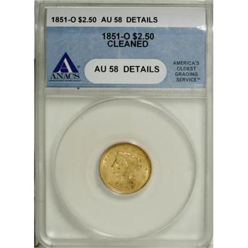 <B>1851-O $2 1/2 --Cleaned--ANACS. AU58 Details.</B></I> Fine hairlines are visible under magnification, yet this yellow-gold specimen retains a fair amount of luster. The design elements are well impressed, except for the typical softness in the eagle's right (left facing) leg. Prospective bidders should not be dissuaded by the ANACS disclaimer, as the cleaning is light and does not significantly detract from the coin's overall eye appeal. The 1851-O is quite rare in full Mint State.<BR><BR><B>Coin Engraver:</B> Christian Gobrecht<BR><BR><b>Shipping:</b> Coins & Currency (<a target="_blank" href="http://www.heritageauctions.com/common/shipping.php">view shipping information</a>)