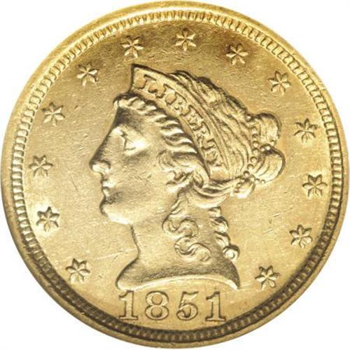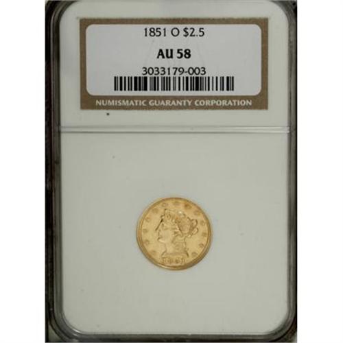 <B>1851-O $2 1/2 AU58 NGC.</B></I> The early 1850s were the heyday for the quarter eagle denomination, which was needed in commerce to replace hoarded silver coinage. But the New Orleans issues are scarcer and lower mintage than their Philadelphia counterparts. This partly lustrous example has few marks, and is well struck save for the eagle's neck.<BR><BR><B>Coin Engraver:</B> Christian Gobrecht<BR><BR><b>Shipping:</b> Coins & Currency (<a target="_blank" href="http://www.heritageauctions.com/common/shipping.php">view shipping information</a>)