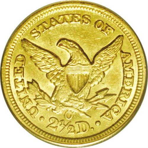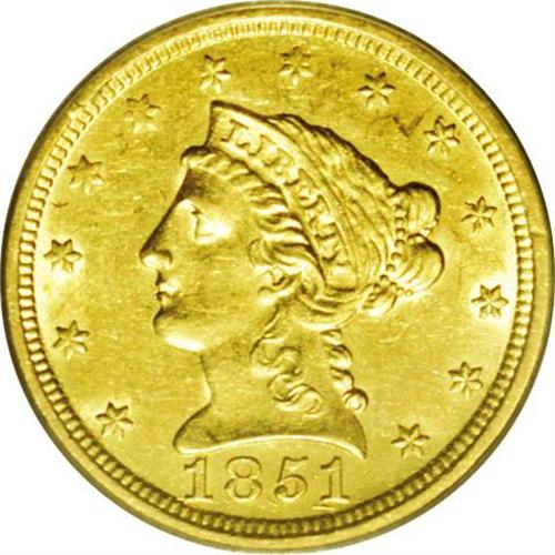 <B>1851-O<$2 1/2> AU58 PCGS.</B></I> Breen-6214. The date was initially entered with a dramatic downward slope, then repunched in the proper position. Ample remnants of the digits from the first punch are present. A suitably struck piece with clean surfaces and substantial bright luster. Scarce in near-Mint condition. Population: 4 in 58, 14 finer (4/06).