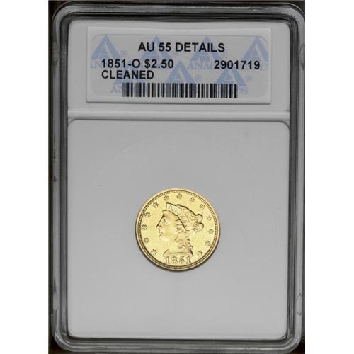 <B>1851-O<$2 1/2>--Cleaned--ANACS. AU55 Details.</B></I> The lemon-yellow surfaces of this typically struck and lightly worn piece are unnaturally bright. A few marks appear in the fields.