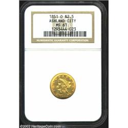 1851-O $2 1/2 MS61 NGC. Breen-6214. The date has been boldly repunched, with the bases of the initial date slanting downward from left to right. It has been our experience that the few Mint State survivors of the '51-O are apt to possess this feature. The coin has a bright, satiny finish and displays a mixture of the yellow-gold alloy and reddish patina that is quite attractive. While better struck than is normally found, the details of the eagle's feathers and talons cannot escape the normal O-mint weakness. Population: 5 in 61, 9 finer (10/02). From the Ashland City Collection. Important notice: We expect to be auctioning lots at the rate of 200-250 per hour. Sometimes eBay Premier live bid software cannot keep up with that pace, so we strongly recommend that you place a realistic proxy bid now as insurance to avoid disappointment. Also please note that all Heritage/CAA lots purchased through eBay Premier carry a 20% Buyer's Premium. Please make sure you read the Terms and Conditions.