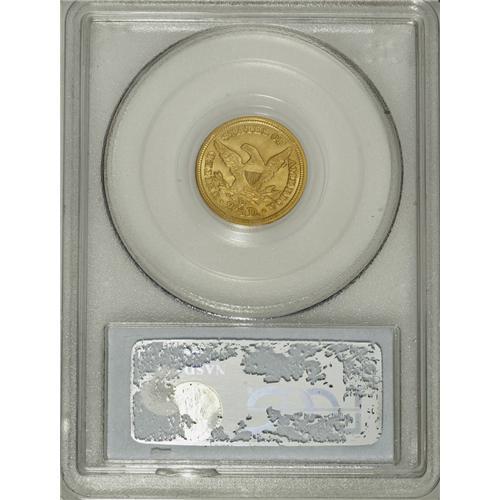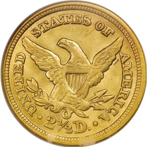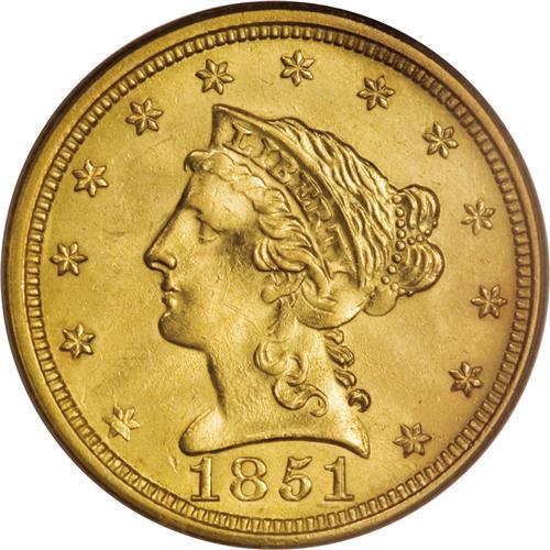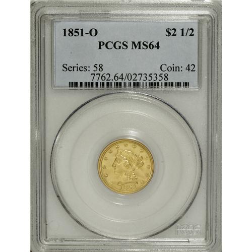 <B>1851-O $2 1/2 MS64 PCGS.</B></I> Breen-6214. Doubled Date. The date was first entered out of position, with remnants of a 51 below and left of the final position. While a common coin by O-mint standards, the 1851-O is an elusive issue in mint condition. In fact, this appears to be the second finest coin known with only one piece certified higher, an NGC MS65. It is the finest certified by PCGS, and the only one at this grade level (4/07). The surfaces display the bright, satiny mint luster one would expect of an O-mint quarter eagle from this period--the obverse is brighter yellow-gold in color and the reverse is more subdued green-gold. The design details display the usual softness that is inherent to this issue with weak definition, especially on the eagle. The peripheral details, though, are surprisingly strong. There are no mentionable surface defects on either side of this exceptional Condition Census quarter eagle.<BR><BR><b>Shipping:</b> Coins & Currency (<a target="_blank" href="http://www.heritageauctions.com/common/shipping.php">view shipping information</a>)