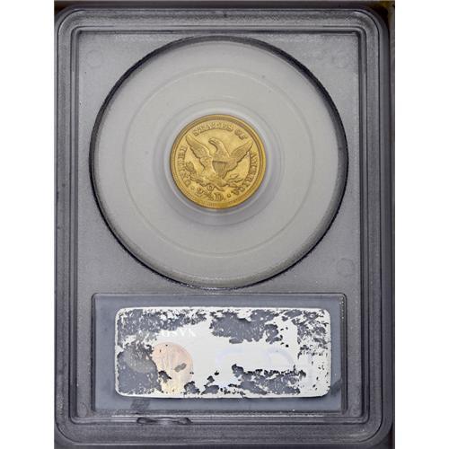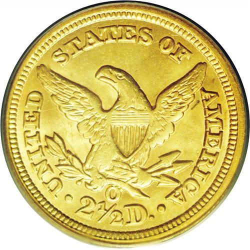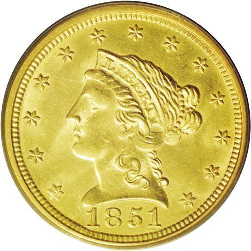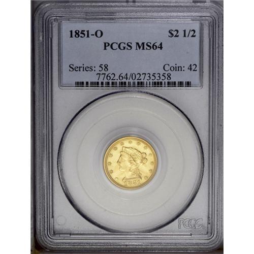 <B>1851-O<$2 1/2> MS64 PCGS.</B></I> Breen-6214. Doubled Date. The date was first entered out of position, with remnants of a 51 below and left of the final position. While a common coin by O-mint standards, the 1851-O is an elusive issue in mint condition. In fact, this appears to be the second finest coin known with only one piece certified higher, an NGC MS65. It is the finest certified by PCGS, and the only one at this grade level. The surfaces display the bright, satiny mint luster one would expect of an O-mint quarter eagle from this period--the obverse is brighter yellow-gold in color and the reverse is more subdued green-gold. The design details display the usual softness that is inherent to this issue with weak definition, especially on the eagle. The peripheral details, though, are surprisingly strong. There are no mentionable surface defects on either side of this exceptional Condition Census quarter eagle. <BR><BR><B>Important notice:</B> Heritage usually auctions material at the rate of 200-250 lots per hour. On some occasions eBay Live bid software or the Internet may not be able to keep up with the pace of the auction. We recommend placing a realistic absentee bid now as insurance to avoid disappointment. Occasionally the auctioneer may eliminate or reject an eBay Live bid, and the auctioneer may also reopen a lot after the close of the eBay live bidding (usually because we missed an audience bid), and may reject your bid even if it shows you as the winning bidder. By bidding via eBay Live, you agree that Heritage may award the lot to another bidder at its sole discretion under the circumstances described above or any other reasonable circumstances. Since eBay bids are not shown to us until we open the lot on the floor, we treat those bids just like floor bids. In most cases the floor responds before the eBay bid is presented to us, due to Internet lag time, so for consistency we have made it a policy that floor bids are always considered first over tie eBay live bids. Also please note that all Heritage lots purchased through eBay Live carry a 20% Buyer's Premium. Please make sure you read the Terms and Conditions before you bid. This lot is being auctioned in conjunction with a live floor auction by Heritage Galleries & Auctioneers. All final auction and invoice information will be supplied by Heritage Galleries & Auctioneers, and all other information should be considered preliminary. Lot:2385 <BR><BR><B>Winning Notification and Billing:</B> After the FINAL session in this auction is complete, Heritage will send e-mail and snail mail invoices. This process normally takes several days. All final auction and invoice information will be supplied by Heritage Galleries & Auctioneers, and all other information should be considered preliminary. <BR><BR>This auction will be conducted on a live auction floor and over the Internet through eBay Live. If you choose to place an absentee bid, please take a moment to <font color='#0000ff'><u><a href='http://pages.ebay.com/liveauctions/help/before/laabsentee.html'>learn how eBay Live absentee bidding works</a></u></font><font color='#000000'>