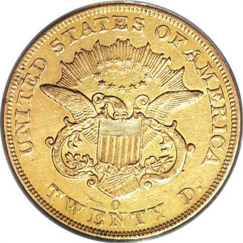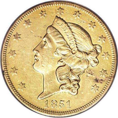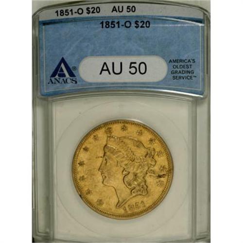 <B>1851-O $20 AU50 ANACS.</B></I> According to Garret and Guth (2006): "The issue was widely distributed and heavily circulated, and most of the survivors grade Very Fine or Extremely Fine. The date is scarce in About Uncirculated and very rare in full Mint State." This green-gold example shows significant portions of remaining mint luster, and the well struck devices are typically worn for the grade. Small to moderate marks are seen on each side, but a prominent planchet lamination (as made), located just behind Liberty's head and between stars 12 and 13, should not be mistaken for an abrasion. <BR><BR><B>Coin Engraver:</B> James B. Longacre<BR><BR><b>Shipping:</b> Coins & Currency (<a target="_blank" href="http://www.heritageauctions.com/common/shipping.php">view shipping information</a>)