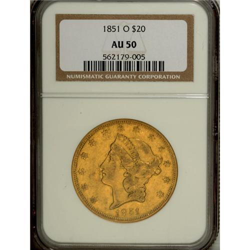 <B>1851-O $20 AU50 PCGS.</B></I> The honey-gold surfaces glow with luster, and a hint of emerald appears in the reverse fields. Well struck with some darkening around the lightly worn devices. The overall eye appeal is pleasing, and this example would be equally suited to a type or date set of New Orleans gold.<BR><BR><b>Shipping:</b> Coin/Currency (<a target="_blank" href="http://www.heritageauctions.com/common/shipping.php">view shipping information</a>)