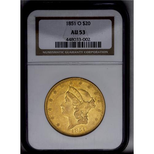 <B>1851-O<$20> AU53 NGC.</B></I> Glowing luster outlines the portrait, and fills the shield and legends. Slight wear is present on Liberty's lower hair tresses, but the fields are only moderately abraded. A sharply impressed representative of this popular issue. The 1851-O is often selected for New Orleans gold type sets, since many of the later O-mint issues are formidable rarities.<BR><I>From The Frank Schwerin Collection.</B></I> <BR><BR><B>Important