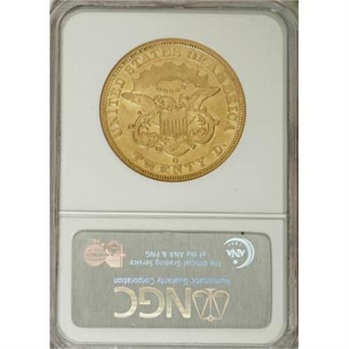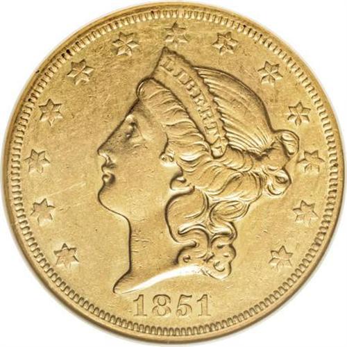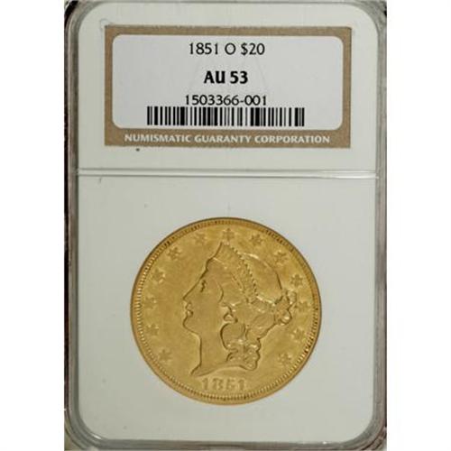 <B>1851-O $20 AU53 NGC.</B></I> Bright luster connects the legends and outlines individual stars. Liberty's hair shows evidence of brief circulation, but neither side has any remotely reportable marks. The 1851-O is often called upon to represent to the denomination in New Orleans type sets.<BR><I>From The Waxhaw Collection.</B></I><BR><BR><B>Coin Engraver:</B> James B. Longacre<BR><BR><b>Shipping:</b> Coins & Currency (<a target="_blank" href="http://www.heritageauctions.com/common/shipping.php">view shipping information</a>)
