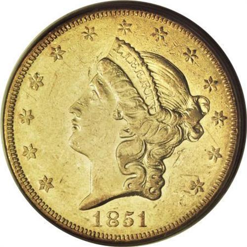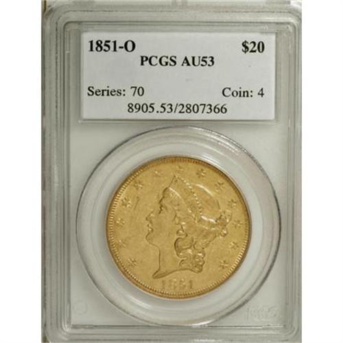 <B>1851-O $20 AU53 PCGS.</B></I> Each side of this yellow-gold O-mint twenty retains strong luster, particularly at the margins. Well struck overall, though the modestly worn portrait is a trifle soft. Light, scattered abrasions and a few more significant marks appear on the obverse. An excellent selection for the Southern gold type collector. Population: 36 in 53, 46 finer (3/08).<BR><BR><B>Coin Engraver:</B> James B. Longacre<BR><BR><b>Shipping:</b> Coins & Currency (<a target="_blank" href="http://www.heritageauctions.com/common/shipping.php">view shipping information</a>)